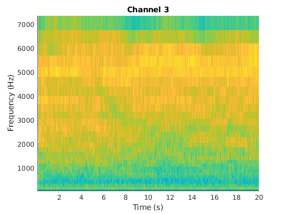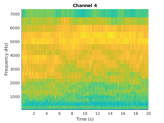 [audioIn,fs] = audioread('AudioArray-16-16-4channels-20secs.wav'); [S,cF,t] = melSpectrogram(audioIn,fs); S = 10*log10(S+eps); % Convert to dB for plotting for i = 1:size(S,3) figure(i) surf(t,cF,S(:,:,i),'EdgeColor','none'); xlabel('Time (s)') ylabel('Frequency (Hz)') view([0,90]) title(sprintf('Channel %d',i)) axis([t(1) t(end) cF(1) cF(end)]) end