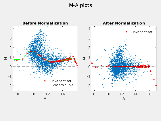 mainvarsetnorm(DataX, DataY)DataY, вектор значений экспрессии генов, к вектору- ссылке, DataX, с использованием метода инвариантного набора. NormDataY является вектором нормализованных значений экспрессии генов из DataY.