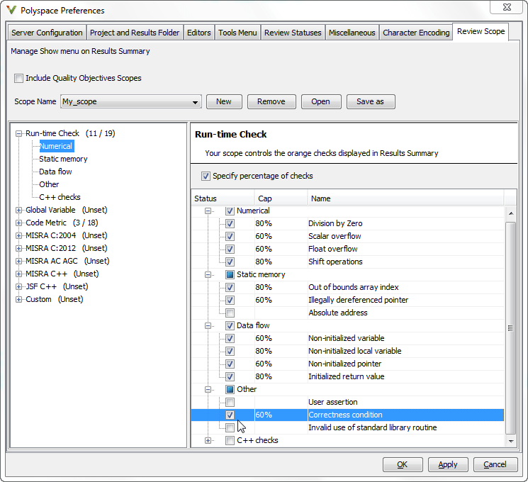 Можно использовать возможности проверки с процентными спецификациями, чтобы убедиться, что по крайней мере 60% (зеленый + оранжевый) проверок являются либо зеленым, либо оправданным оранжевым. Для обоснования проверки необходимо назначить Status из No action planned или Justified. Для получения дополнительной информации смотрите Адрес Polyspace Результаты через исправления ошибок или обоснования.