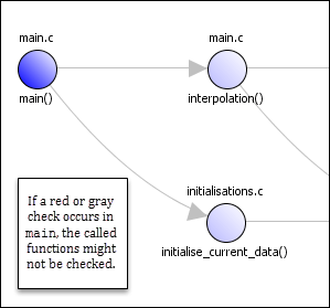 Если вы вызываете функции из неотключенного блока кода, верификация также не проверяет эти функции. При наличии красной или серой проверки в начале иерархии вызовов функции в иерархии могут не проверяться. Вы получаете значительное количество непроверенного кода.