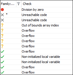 * Для большинства проверок программное обеспечение завершает путь выполнения после первой ошибки времени выполнения на пути. Поэтому, если она доказывает определенную ошибку (красную) или отсутствие ошибки (зеленую) в операции, доказательство допустимо только для путей выполнения, которые еще не были завершены в этой точке кода. Смотрите Анализ Code Prover После красных и оранжевых проверок.