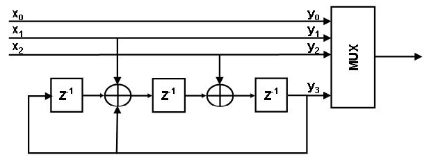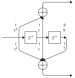 Используйте структуру шпалеры, чтобы сконфигурировать сверточный код скорости 1/2 с прямой связью в этой схеме. Схема указывает двоичные значения и полиномиальную форму, указывая, что самый левый бит является самым значимым-битом (MSB).