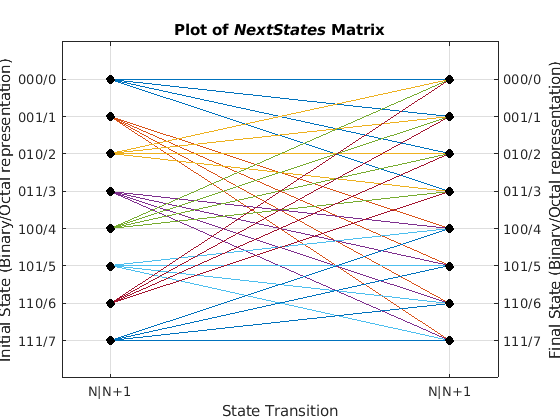 nextStates - Следующие состоянияСледующие состояния для всех комбинаций состояний тока и входов тока, возвращенные как numStates-by-2K матрица, где K представляет количество входных битовых потоков.