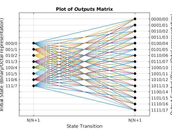 Поле структуры numInputSymbols равен 4, потому что два потока битов могут производить четыре различных входных символа. Поле структуры numOutputSymbols равен 8, потому что три потока битов производят восемь различных выходных символов. Поскольку энкодер имеет семь общих регистров сдвига, количество возможных состояний , как показано на nextStates поле.
