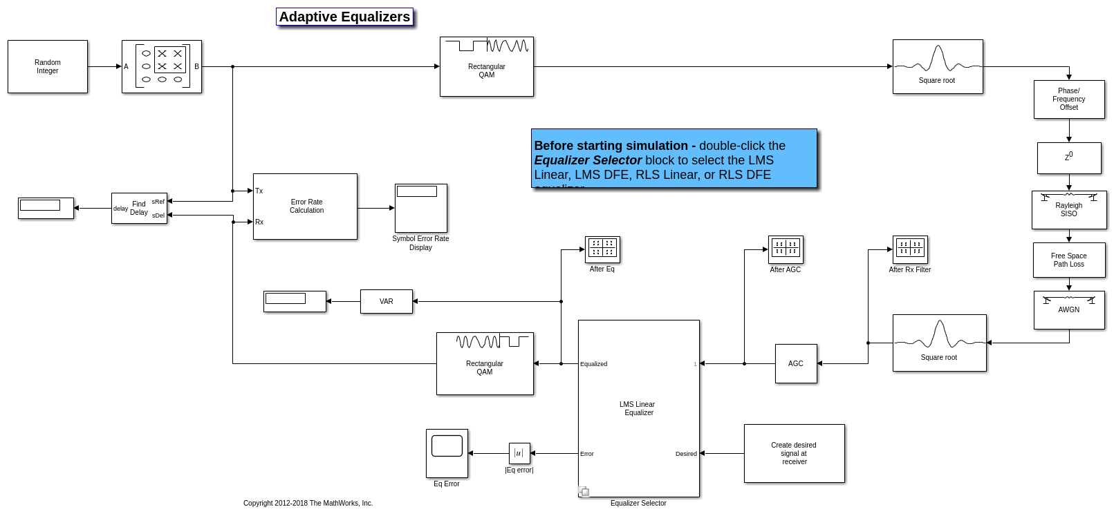 Эта модель показывает поведение выбранного адаптивного эквалайзера в ссылке связи, который имеет канал с замираниями. Передатчик и приемник имеют корневую повышенную косинусоидальную импульсную фильтрацию. Блок подсистемы позволяет вам выбрать между линейными или решающими эквалайзерами с обратной связью, которые используют адаптивный алгоритм наименьшего среднего квадрата (LMS) или рекурсивного наименьшего квадрата (RLS).