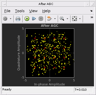 Глубокие затухания канала и потери пути могут привести к тому, что уровень входного сигнала эквалайзера будет намного меньше необходимого уровня выходного сигнала и привести к недопустимо длительному времени сходимости эквалайзера. The AGC блок регулирует величину принимаемого сигнала, чтобы уменьшить время сходимости эквалайзера. Необходимо настроить оптимальный уровень выходной степени усиления на основе выбранной схемы модуляции. Для 16QAM используется желаемая выходная степень 10 Вт.