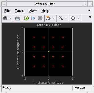 Передатчик генерирует 16QAM данные случайных сигналов, которые включают в себя обучающую последовательность и применяет корневую приподнятой косинусоидальной импульсной фильтрации.