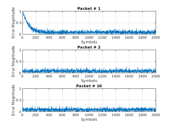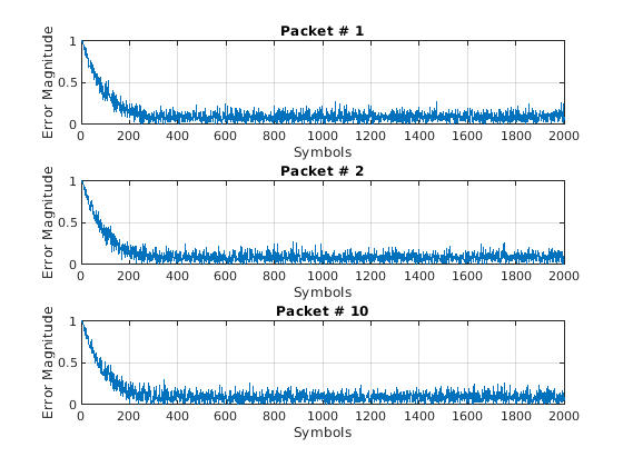 for p=1:numPackets data = randi([0 M-1],numSymbols,1); tx = pskmod(data,M,pi/4); rx = awgn(raylChan(tx),SNR); rxDelay = finddelay(rx,tx); [y,err,wts] = lineq(rx,adaptWeights); y = phaseCorrection(y); evmEst = evm(y); adaptWeights = (evmEst > 20); updateFigures(errPlot,evmPlot,scatSym,adaptState, ... wts,y(end),evmEst,adaptWeights,p,numPackets) end