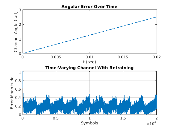 График показывает чрезмерные ошибки после периода обучения 1000 символов. При демодуляции символов и вычислении ошибок символов, для расчета безсовпадающего вывода и системной задержки между выходом эквалайзера и переданными символами, пропустите первые 2000 символов.