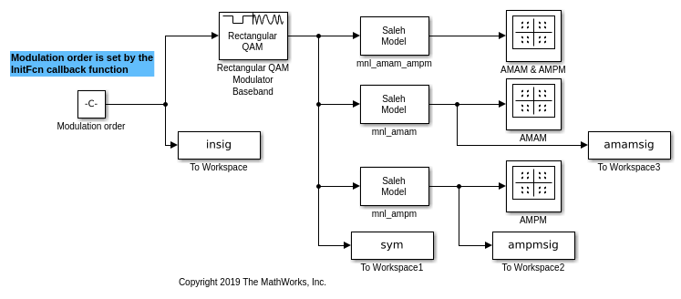 Чтобы запустить модель самостоятельно, откройте пример с помощью предоставленной кнопки или путем ввода open cm_mnl_saleh_16qam в командной строке MATLAB ®. Попробуйте настроить параметры для Memoryless Nonlinearity блоки в: