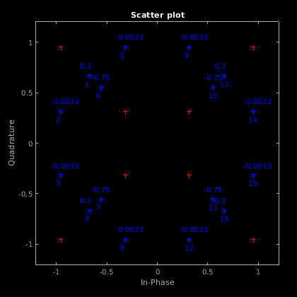 Этот рассеянный график показывает точки созвездия, перемещенные только искажением AM/AM. Местоположения точек созвездия помечаются, чтобы выделить относительное расстояние, на котором каждая точка переместилась из идеального местоположения точки совокупности. Чтобы анализировать величину и направление, в котором перемещается каждая точка созвездия, для текущих рабочих характеристик необходимо будет перенести характеристическую кривую I-O модели Салеха.