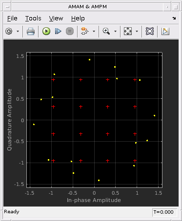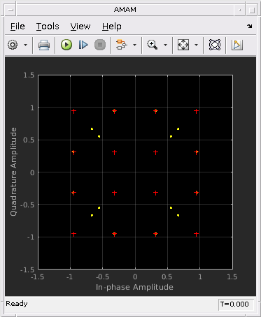 The AMAM Схема показывает сигнал с амплитудно-амплитудным искажением, но без амплитудно-фазового искажения. На этой схеме заметьте, что точки созвездия смещены радиально от или к источнику. Для модели Салеха и заданных рабочих характеристик внутренние угловые точки созвездия отходят от источника, а внешние угловые точки созвездия перемещаются к источнику. Некорнерные точки созвездия перемещаются на незначительную величину.