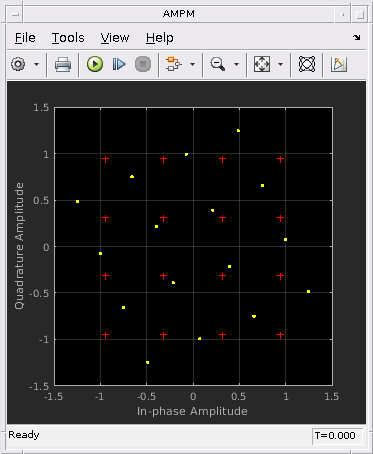The AMPM Схема показывает сигнал с амплитудно-фазовым искажением, но без амплитудно-амплитудного искажения. В этой схеме заметьте, что точки созвездия повернуты против часовой стрелки. Точки созвездия, расположенные дальше от источника, перемещаются больше, чем точки, расположенные ближе к источнику.