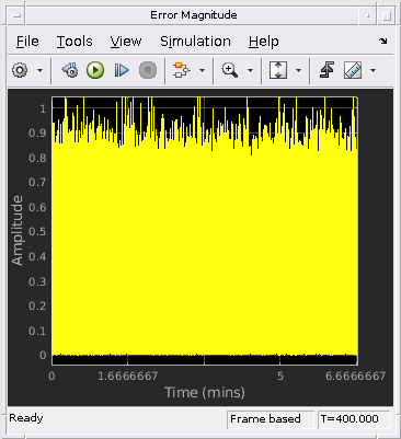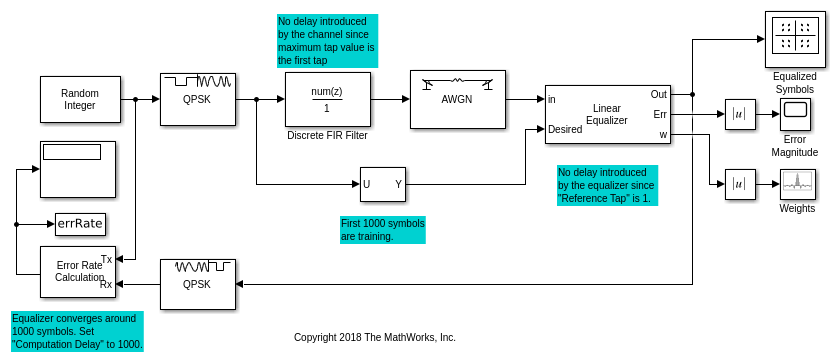 Задержка между переданным и принятым сигналом не вводится, потому что максимальное значение отвода является первым отводом дискретной конечной импульсной характеристики, и контрольным отводом эквалайзера является 1. Эквалайзер сходится после примерно 1000 символов, поэтому это значение используется для вычислительной задержки Error Rate Calculation блок.