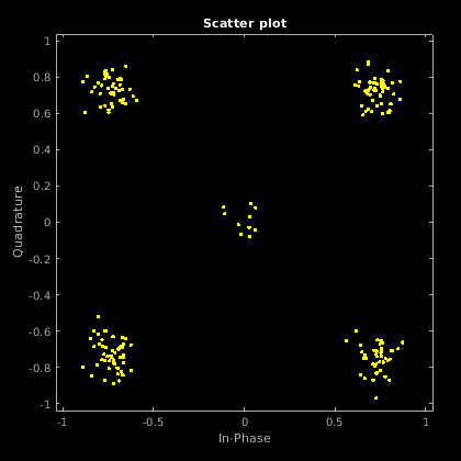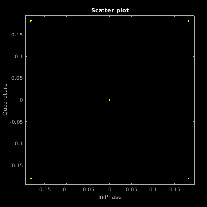Можно отобразить сигнальное созвездие переданного сигнала, используя scatterplot. Поскольку сигнал передискретизирован на выходе фильтра, необходимо децимировать на количество выборок на символ, чтобы график поля точек не показывал путь перехода между точками созвездия. Если бы сигнал имел смещение по времени, вы могли бы обеспечить, что в качестве параметра входа для отображения сигнального созвездия с исправленным смещением по времени.