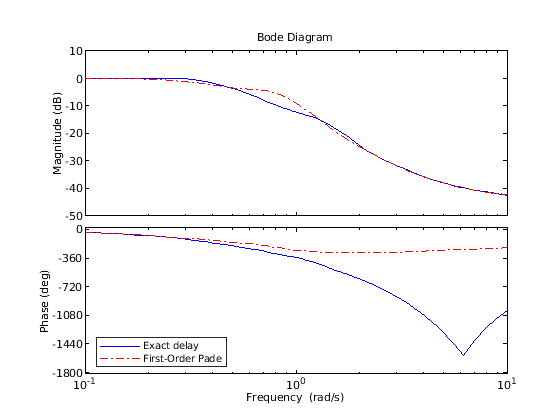 h = bodeoptions; h.PhaseMatching = 'on'; bodeplot(Tcl,'-b',Tnd1,'-.r',{.1,10},h); legend('Exact delay','First-Order Pade','Location','SouthWest');