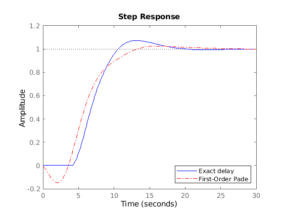 stepplot(Tcl,'-b',Tnd1,'-.r'); legend('Exact delay','First-Order Pade','Location','SouthEast');