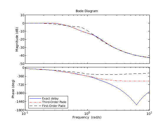 bodeplot(Tcl,'-b',Tnd3,'-.r',Tnd1,'--k',{.1,10},h); legend('Exact delay','Third-Order Pade','First-Order Pade',... 'Location','SouthWest');