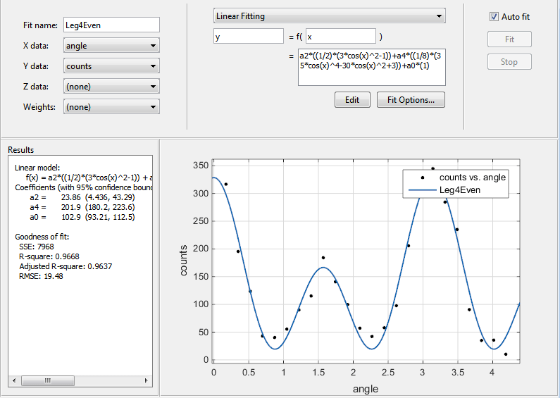 + b*((1/8)*(35*cos(x)^4-30*cos(x)^2+3)) + cЗагрузите angle и counts переменные в рабочей области.