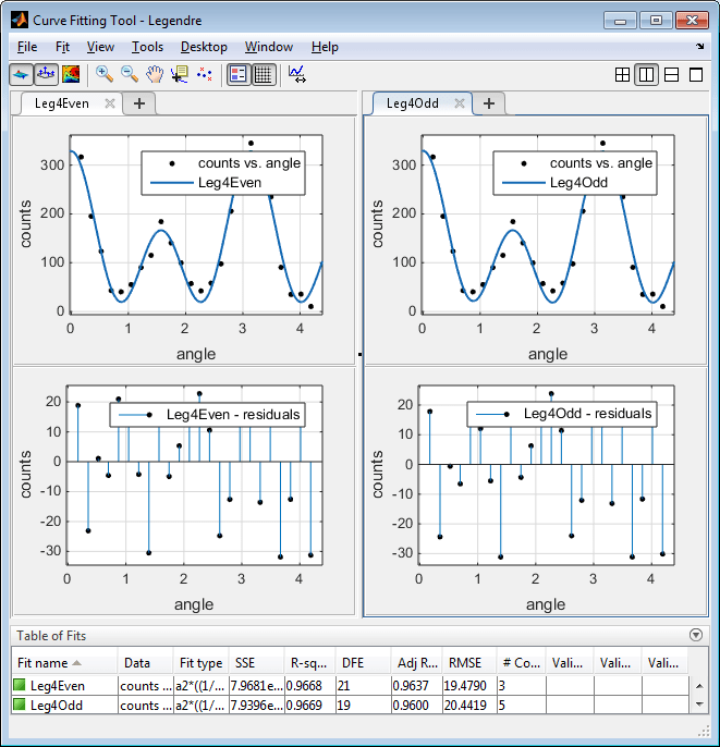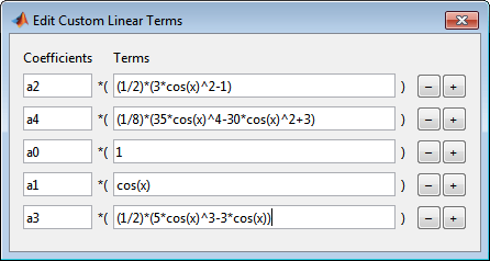 Вы используете Linear Fitting вместо Custom Equation подгонка типа, потому что полиномы Лежандра зависят только от переменной предиктора и констант. Уравнение, которое вы зададите для модели, является y 1 (x) (то есть уравнение, данное в начале этой процедуры). Потому что angle дается в радианах, аргумент терминов Legendre задается cos (