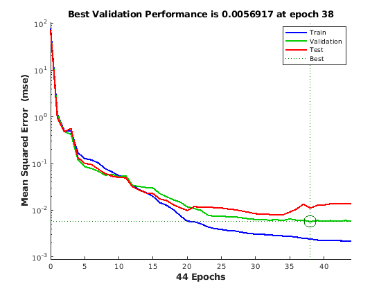 Это обучение остановилось, когда ошибка валидации увеличилась в течение шести итераций, которые произошли на итерации 44.