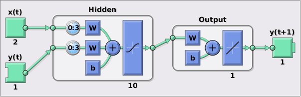 Стандартная сеть NARX является 2-х слойной сетью прямого распространения с передаточной функцией сигмоида в скрытом слое и линейной передаточной функцией в выход слое. Эта сеть также использует выделенные линии задержки для хранения предыдущих значений x (t) и y (t) последовательностей. Обратите внимание, что выход сети NARX y (t) подается назад на вход сети (через задержки), так как y (t) является функцией y (t - 1), y (t - 2),..., y (t - d). Однако для эффективного обучения этот цикл обратной связи может быть открыт.