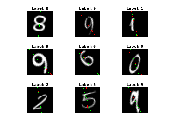 idx = randperm(size(XTest,4),9); figure for i = 1:9 subplot(3,3,i) I = XTest(:,:,:,idx(i)); imshow(I) hold on sz = size(I,1); offset = sz/2; thetaPred = Y2Pred(idx(i)); plot(offset*[1-tand(thetaPred) 1+tand(thetaPred)],[sz 0],'r--') thetaValidation = Y2Test(idx(i)); plot(offset*[1-tand(thetaValidation) 1+tand(thetaValidation)],[sz 0],'g--') hold off label = string(Y1Pred(idx(i))); title("Label: " + label) end