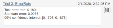 Он вычисляет стандартную ошибку (testErrorSE) и приблизительно 95% доверительный интервал (testError95CI) частоты обобщения ошибки путем обработки классификации каждого изображения в тестовом наборе как независимого события с определенной вероятностью успеха. Используя это предположение, количество неправильно классифицированных изображений следует биномиальному распределению. Этот метод часто называют методом Вальда.