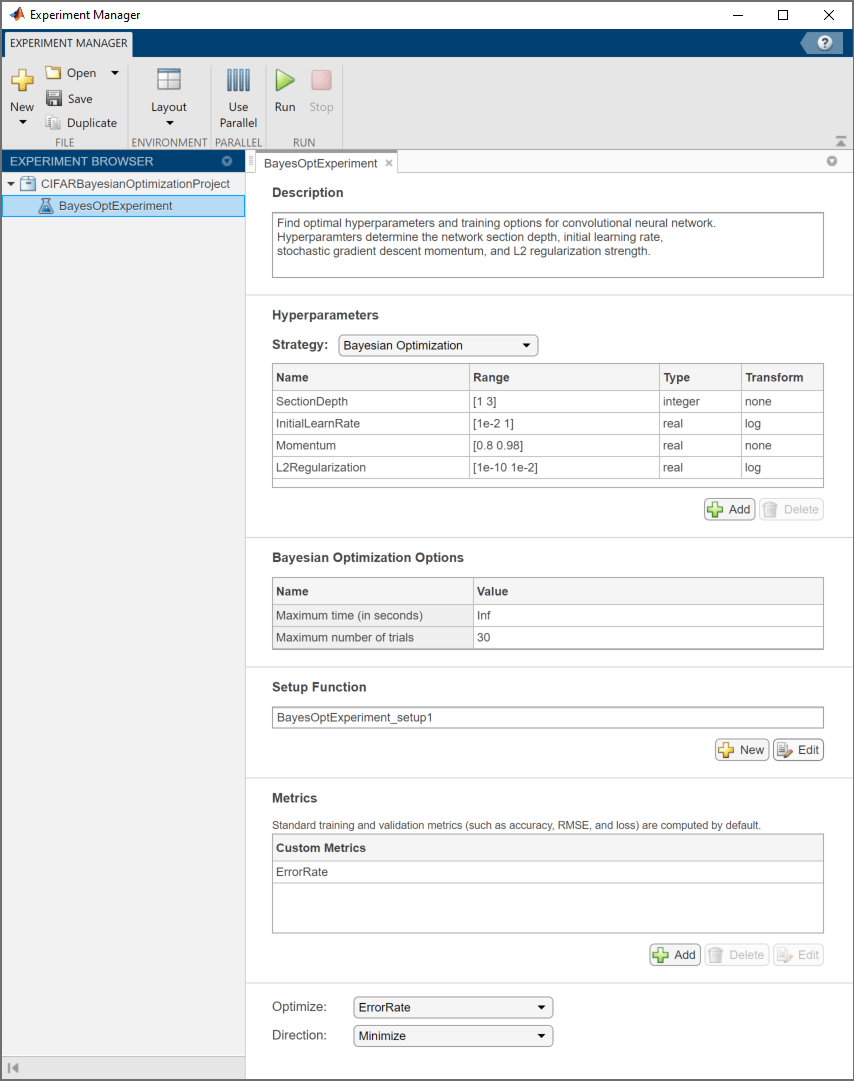 Поля Optimize и Direction указывают метрику, которую использует алгоритм оптимизации Байеса в качестве целевой функции. Для этого эксперимента Experiment Manager стремится минимизировать значение ErrorRate метрический.