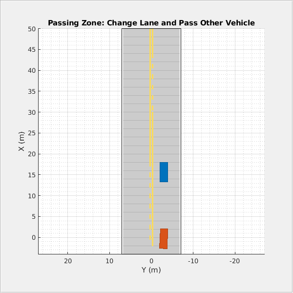 close all; figScene = figure; set(figScene,'Position',[0 0 600 600]); hPanel = uipanel(figScene); hPlot = axes(hPanel); plot(scenario,'Parent',hPlot); title('Passing Zone: Change Lane and Pass Other Vehicle') % Run the simulation while advance(scenario) pause(0.01) end