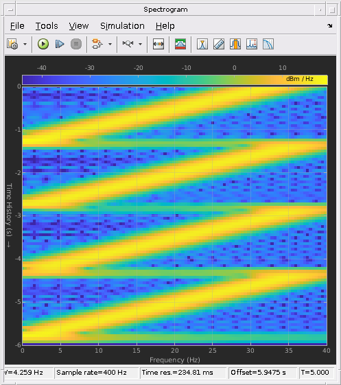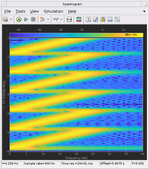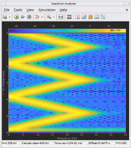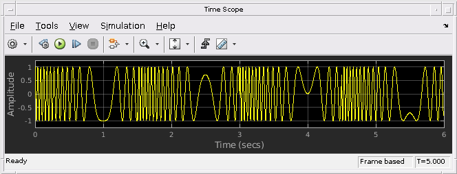 Блок Chirp выводит частотно-модулированный косинус (щебет) сигнал с амплитудой единицы и непрерывной фазой. Чтобы задать необходимый выходной щебет, вы должны задать его функцию мгновенной частоты, также известную как выход частоты. Свип частоты может быть линейным, квадратичным или логарифмическим и повторяется один раз в Sweep time по умолчанию. Описание алгоритмов, используемых блоком Chirp, смотрите в Алгоритмах.