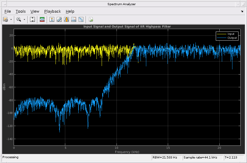 The dsp.HighpassFilter Системная object™ независимо фильтрует каждый канал входа с течением времени, используя данные проекты спецификации. Можно задать FilterType свойство dsp.HighpassFilter на 'FIR' или 'IIR' для реализации объекта в виде конечных импульсных характеристик или БИХ высокочастотного фильтра.