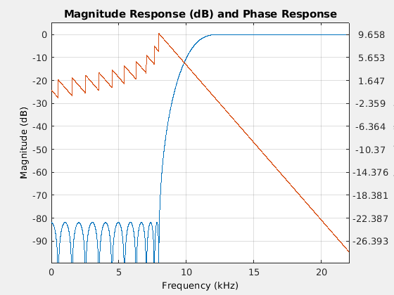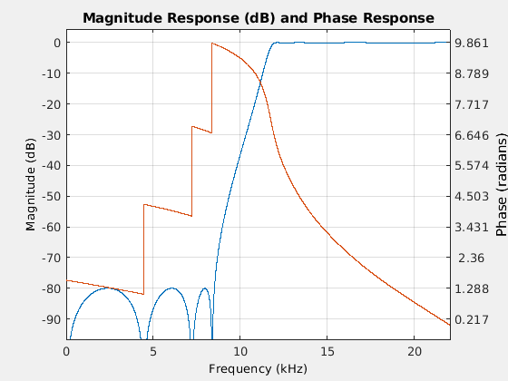 возвращает фильтр highpass конечной импульсной характеристики минимального порядка, HPF = dsp.HighpassFilterHPF, с настройками фильтра по умолчанию. Вызов объекта с настройками свойств по умолчанию фильтрует входные данные с частотой в полосе стоп- 8 кГц, ширина полосы пропускания 12 кГц, затухание в полосе задерживания 80 дБ и неравномерность в полосе пропускания 0.1 дБ.