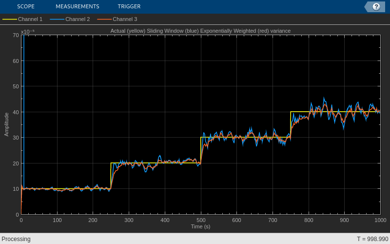 The dsp.MovingVariance Система object™ вычисляет отклонение входного сигнала по каждому каналу независимо с течением времени. Объект использует метод скользящего окна или экспоненциала метод взвешивания, чтобы вычислить движущееся отклонение. В методе раздвижного окна окно заданной длины перемещается по данным, выборке за выборкой, и отклонение вычисляется по данным в окне. В экспоненциальном методе взвешивания объект вычитает каждую выборку данных из среднего значения, квадратов различия и умножает квадратный результат на весовой коэффициент. Затем объект вычисляет отклонение, добавляя все взвешенные данные. Для получения дополнительной информации об этих методах см. «Алгоритмы».