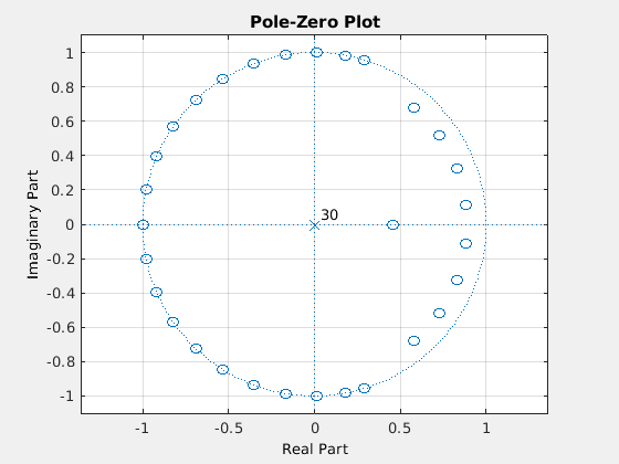 Просмотр графика нулей и полюсов, показанного здесь, показывает, что это минимальный фазовый конечная импульсная характеристика - нули лежат на единичной окружности или внутри нее, z = 1
