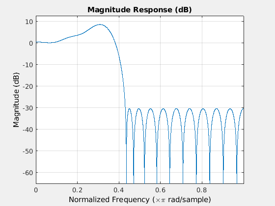 Проектируйте конечная импульсная характеристика 30-го порядка с invsinc ключевое слово для формирования полосы пропускания фильтра с функцией обратной синхронизации.