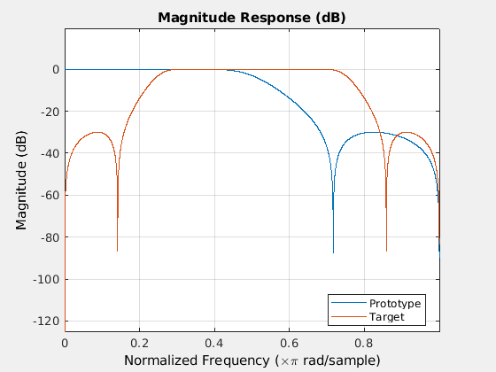 Функция также возвращает числитель AllpassNumи знаменатель, AllpassDen, фильтра отображения allpass. Lowpass прототипа задается числителем B и знаменатель A.