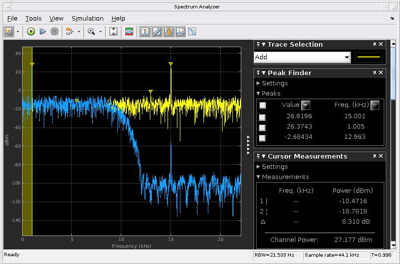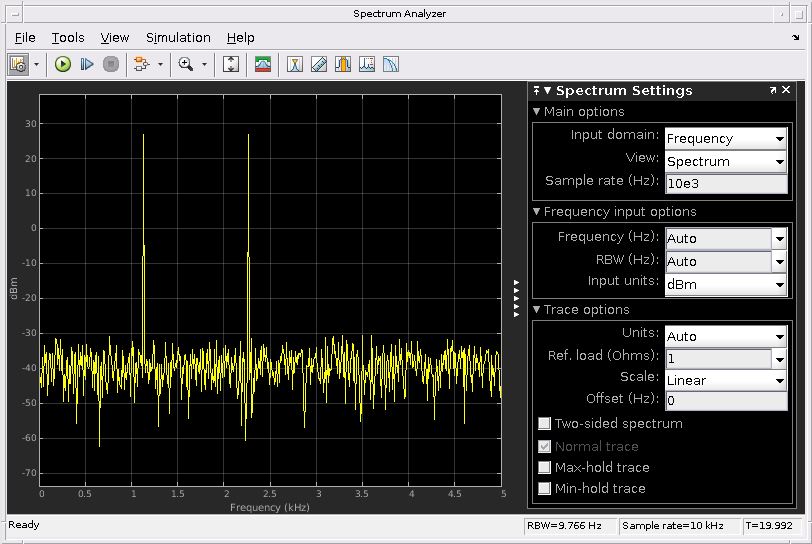 Span (Hz) - Частотный диапазон в герц 10e3 (по умолчанию) | реальная положительная скалярная величинаЗадайте частотный диапазон в hertz. Используйте этот параметр с CF (Hz) параметр для определения диапазона частот вокруг центральной частоты. Этот параметр определяет область значений значений, показанных на Оси Частот в окне Анализатор Спектра.