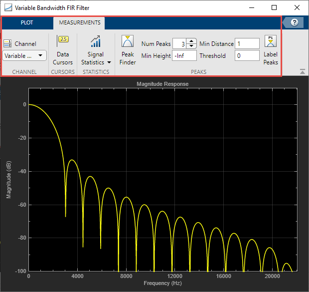 Открывает динамический визуализатор фильтра и отображает величину ответ фильтра конечной импульсной характеристики полосы пропускания переменной. Ответ основан на параметрах, выбранных в диалоговом окне Параметров блоков. Чтобы обновить реакцию величины во время работы динамического фильтра-визуализатора, измените параметры в диалоговом окне и нажатии кнопки Apply.