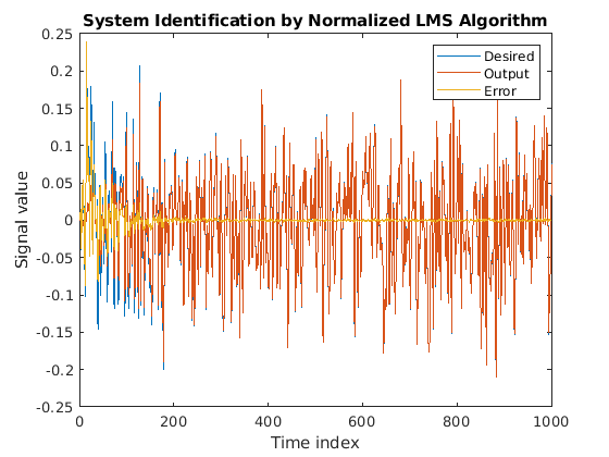 plot(1:1000, [d,y,e]) title('System Identification by Normalized LMS Algorithm') legend('Desired','Output','Error') xlabel('Time index') ylabel('Signal value')