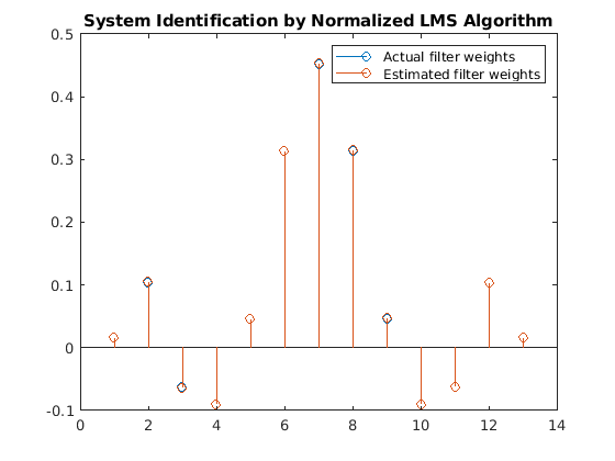 stem([(filt.Numerator).' w]) title('System Identification by Normalized LMS Algorithm') legend('Actual filter weights','Estimated filter weights',... 'Location','NorthEast')