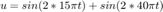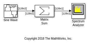 Используйте блок Sine Wave, чтобы сгенерировать две синусоиды, один с частотой 15 Гц, а другой с частотой 40 Гц. Используйте блок Matrix Sum, чтобы добавить синусоиды по точкам, чтобы сгенерировать составную синусоиду: