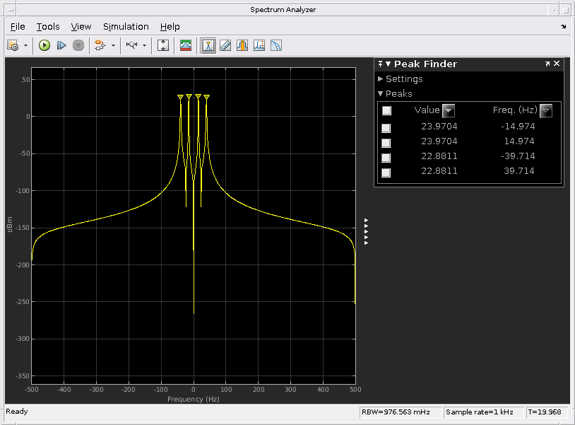Область возможностей показывает, как и ожидалось, peaks на частотах 15 и 40 Гц. Теперь вы преобразовали два синусоидальных сигнала из временного интервала в частотный диапазон.