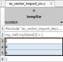 Предположим, ваш внешний код определяет параметр вектора myGains с тремя элементами. Сохраните определение в текущей папке в файле с именем ex_vector_import_src.c.