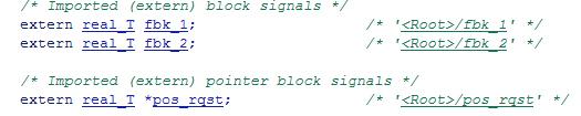 Система имеет три входных сигналов: pos_rqst, fbk_1, и fbk_2. Сгенерированный код обращается к двум сигналам обратной связи через прямую ссылку на импортированные глобальные переменные (класс памяти ImportedExtern). Код обращается к сигналу положения через импортированный указатель (класс памяти ImportedExternPointer).