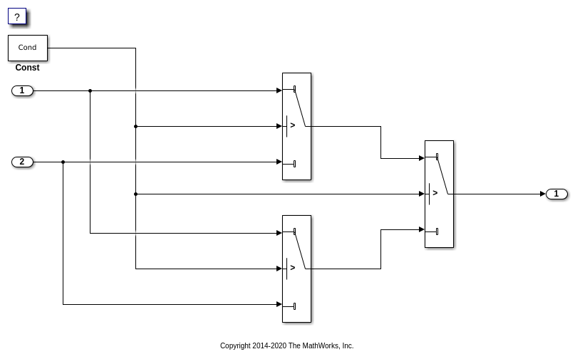 rtwdemo_controlflow_opt модели содержит три блока Switch. Блок Constant обеспечивает вход управления для блоков Switch. Переменная с именем Cond определяет значение блока Constant.