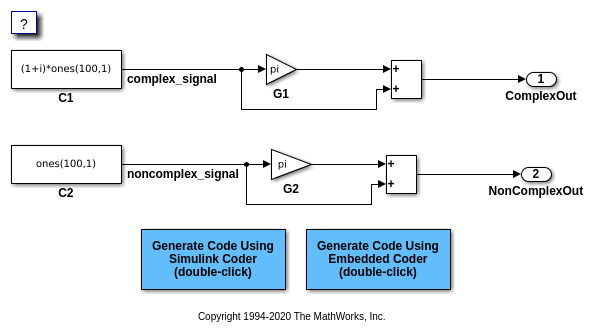 Этот пример показывает, как Simulink Coder эффективно обрабатывает сложные сигналы. Чтобы просмотреть типы данных сигналов, обновите модель. В меню Debug выберите Update Model. Комплексные сигналы представлены как структуры в сгенерированном коде. Simulink Coder выполняет различные оптимизации на этих структурах. Для примера: