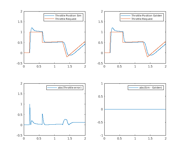 Тестовая обвязка сравнивает результаты симуляции с золотыми данными, что является набором результатов тестирования, которые указывают на желаемое поведение модели. В этой модели блок V&V Assertion сравнивает смоделированное положение значения дросселя от объекта с золотым значением, которое обеспечивает тестовую обвязку. Если различие между этими двумя сигналами больше 5%, тест прекращает работать, и блок Assertion останавливает симуляцию.