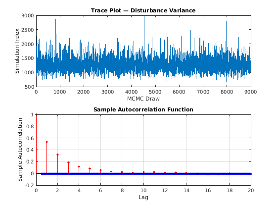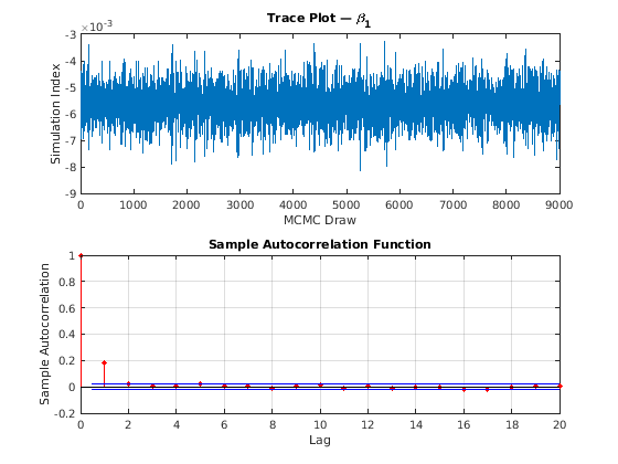 figure; subplot(2,1,1) plot(PosteriorMdl.BetaDraws(2,1001:end)); title(['Trace Plot ' char(8212) ' \beta_1']); xlabel('MCMC Draw') ylabel('Simulation Index') subplot(2,1,2) autocorr(PosteriorMdl.BetaDraws(2,1001:end)) figure; subplot(2,1,1) plot(PosteriorMdl.Sigma2Draws(1001:end)); title(['Trace Plot ' char(8212) ' Disturbance Variance']); xlabel('MCMC Draw') ylabel('Simulation Index') subplot(2,1,2) autocorr(PosteriorMdl.Sigma2Draws(1001:end))