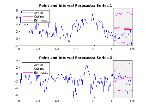 figure subplot(2,1,1) hold on plot(idx0,Y0(:,1),'b'); h = plot(idx1,Y1(:,1),'b--'); h1 = plot(idx1,YF1(:,1),'r'); h2 = plot(idx1,YF2(:,1),'m'); ciu = YF2(:,1) + 1.96*sqrt(estVar1'); % Upper 95% confidence level cil = YF2(:,1) - 1.96*sqrt(estVar1'); % Lower 95% confidence level plot(idx1,ciu,'m-.'); plot(idx1,cil,'m-.'); yfill = [ylim,fliplr(ylim)]; xfill = [idx0(end) idx0(end) idx1(end) idx1(end)]; fill(xfill,yfill,'k','FaceAlpha',0.05) legend([h h1 h2],["Actual" "Optimal" "Estimated"],... 'Location',"NorthWest") title("Point and Interval Forecasts: Series 1") hold off subplot(2,1,2) hold on plot(idx0,Y0(:,2),'b'); h = plot(idx1,Y1(:,2),'b--'); h1 = plot(idx1,YF1(:,2),'r'); h2 = plot(idx1,YF2(:,2),'m'); ciu = YF2(:,2) + 1.96*sqrt(estVar2'); % Upper 95% confidence level cil = YF2(:,2) - 1.96*sqrt(estVar2'); % Lower 95% confidence level plot(idx1,ciu,'m-.'); plot(idx1,cil,'m-.'); yfill = [ylim,fliplr(ylim)]; xfill = [idx0(end) idx0(end) idx1(end) idx1(end)]; fill(xfill,yfill,'k','FaceAlpha',0.05) legend([h h1 h2],["Actual" "Optimal" "Estimated"],... 'Location',"NorthWest") title("Point and Interval Forecasts: Series 2") hold off